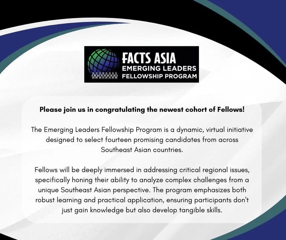 Organised by FACTS Asia Center Incorporated, the Emerging Leaders Fellowship is a year-long programme designed to strengthen the next generation of policy thinkers through research mentorship, analytical training, and public engagement. The fellowship includes thematic workshops on regional and non-traditional security, policy writing, combating disinformation, and public communication, led by experts from leading institutions.